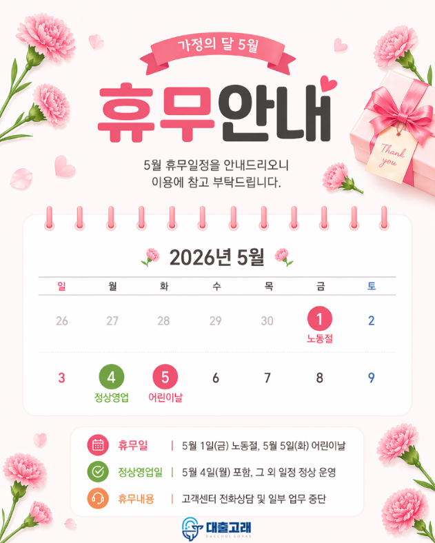 ● 정상영업일 : 2026년 5월 4일(월) 포함, 휴무기간 외 정상 운영